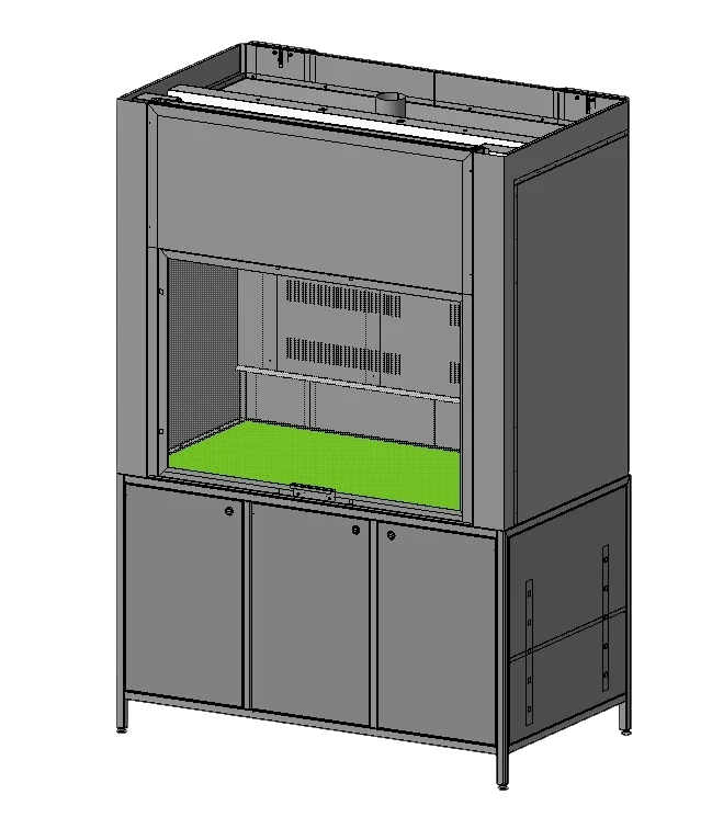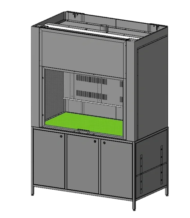 Все модели оснащены: верхней части шкафа установлен светильник люминесцентный с двумя лампами по 18 Вт. На правой стороне шкафа расположена панель управления с индикацией включения, двуфазным автоматом отключения на 16 А, двумя розетками с брызгозащищенными крышками, выключателем освещения камеры шкафа, выключателем канального вентилятора. В левой стороне шкафа расположен противовес защитного экрана. Рабочая поверхность шкафа выполнена из керамогранитной плиты. Шкаф имеет двойную заднюю стенку. Вытяжная камера имеет четыре зоны вытяжки газов различной удельной плотности. На задней стенке шкафа может быть установлен кран для воды или технических газов. В рабочую поверхность могут быть установлены раковины из нержавеющей стали, полипропилена или слив, а также смеситель для воды или химически стойкий кран. В нижней части могут быть установлены тумбы сантехнические, тумбы с дверкой и полкой для хранения или тубы с ящиками. Тумба для хранения может быть вентилируемой.