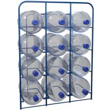 Стационарный стеллаж. Предназначен для компактного хранения 19-ти литровых бутылей с питьевой водой. Устанавливается в торговых залах, офисах и на складах. Изготовлен из круглых металлических труб. Направляющие для бутылей имеют легкий угол наклона, что позволяет надежно фиксировать емкость в своей ячейке. Возможно изготовление стеллажей для 3, 6, 9, 12, 16 бутылей. Типоразмеры: СВД-3 - 335х380х919 мм; СВД-6 - 640х380х915 мм; СВД-9 - 940х380х919 мм; СВД-12 - 940х380х1200 мм; СВД-16 - 1250х380х1200 мм.