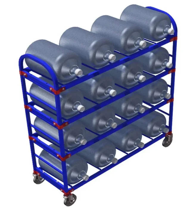 Передвижной стеллаж для 19-ти литровых бутылей с водой - 16 шт. может использоваться, как в офисах, производстве, так и в торговых сетях. Стеллаж изготовлен из труб прямоугольного, квадратного и круглого сечения, цельносварной. Поставляется в собранном виде. В комплекте метизы и уголки в комплекте. Полимерная порошковая окраска позволяет работать на открытом воздухе при атмосферных осадках.