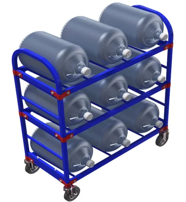 Передвижной стеллаж для 19-ти литровых бутылей с водой - 9 шт. может использоваться, как в офисах, производстве, так и в торговых сетях. Стеллаж изготовлен из труб прямоугольного, квадратного и круглого сечения, цельносварной. Поставляется в собранном виде. В комплекте метизы и уголки в комплекте. Полимерная порошковая окраска позволяет работать на открытом воздухе при атмосферных осадках.