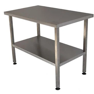Конструкция стола разборная - удобная для транспортировки. Усиленный стальной каркас и его стяжки изготовлены из профильной трубы с регулируемыми по высоте ножками. Столешница с бортиком выполнены из нержавеющей стали марки AISI 304 с подкладкой из ЛДСП или фанеры.