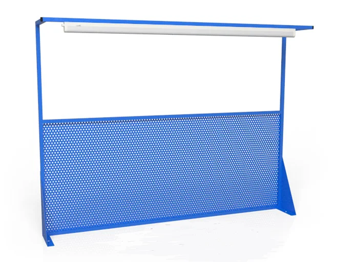 Перфорированный экран – Э 1.4 с лампой применяется для доукомплектования верстаков. Перфорированный экран не входит в стандартную комплектацию верстаков и приобретается отдельно. В комплектацию перфорированного экрана входят также два кронштейна для крепления экрана к рабочей поверхности верстака металлического и крепеж.