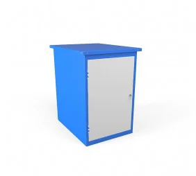 Тумба слесарная ТСН-1 имеет цельносварную конструкцию. Столешница состоит из влагостойкой подложки толщиной 24 мм и листа оцинковки 0,8 мм. Тумба укомплектована распашной дверью закрывающуюся на почтовый замок. За дверью расположена металлическая полка. Сварная конструкция изделия свободно выдерживает ударно-маятниковые нагрузки, при работе напильниками, молотками, зубилами и ножовками по металлу. Покраска полимерно-порошковая, покрашены фасад ящиков-RAL 5002 (синий), каркас верстака-RAL7035 (светло-серый).