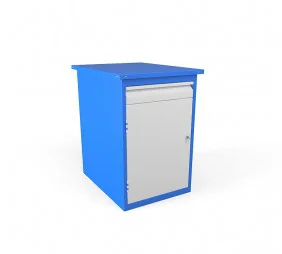 Тумба слесарная ТСН-2 имеет цельносварную конструкцию. Столешница состоит из влагостойкой подложка толщиной 24 мм и листа оцинковки 0,8 мм. Тумба укомплектована малым выдвижным ящиком под инструмент на шариковых телескопических направляющих полного выдвижения и распашной дверью, закрывающуюся на почтовый замок. За дверью расположена металлическая полка. Сварная конструкция изделия свободно выдерживает ударно – маятниковые нагрузки, при работе напильниками, молотками, зубилами и ножовками по металлу. Покраска полимерно-порошковая, покрашены фасад ящиков-RAL 5002 (синий), каркас верстака-RAL7035 (светло-серый).