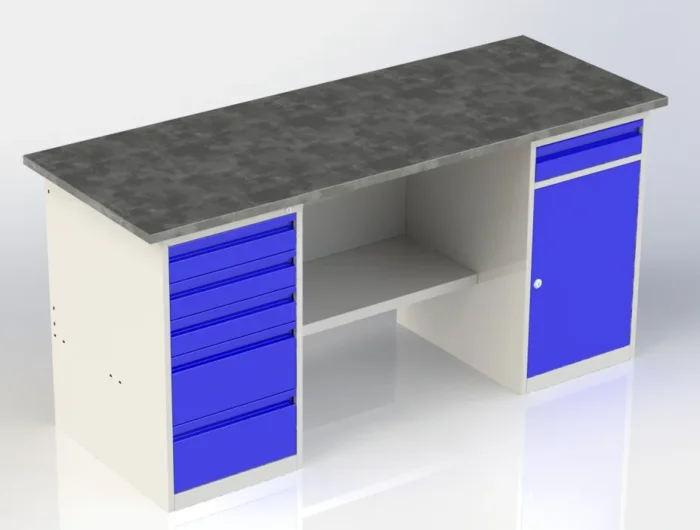 Столешница верстака серии ВП состоит из подложки 24 мм, покрытая листом оцинкованного металла от 1,2 мм. Верстак ВП7 укомплектован двумя тумбами: тумба с выдвижным ящиком с верху и распашной дверью с одной полкой внутри Т-3, а так же тумбой с пятью выдвижными ящиками Т- 2.