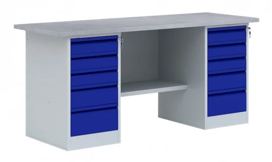 Столешница верстака серии ВП 5 состоит из подложки 24 мм, покрытая листом оцинкованного металла от 1,2 мм. Верстак ВП 5 укомплектован двумя тумбами с пятью выдвижными ящиками Т-2.