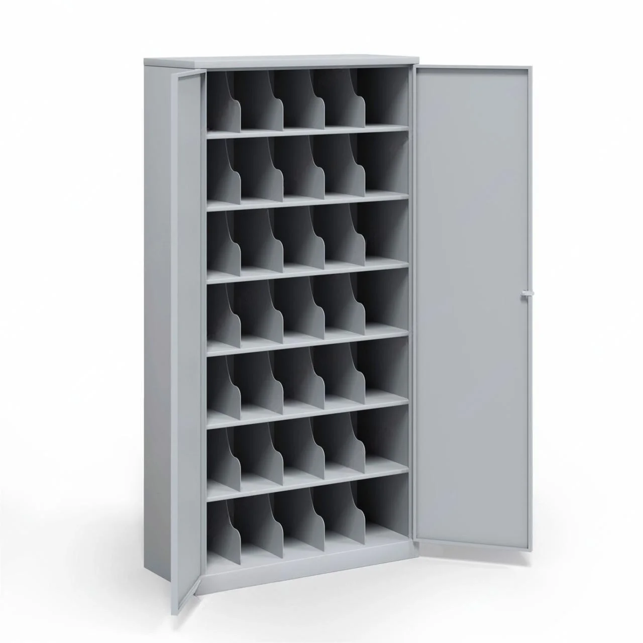 - 35 ячеек, две дверцы, скошенные полки для удобства хранения СИЗ.