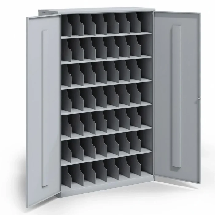 - 56 ячеек, две дверцы, скошенные полки для удобства хранения СИЗ.