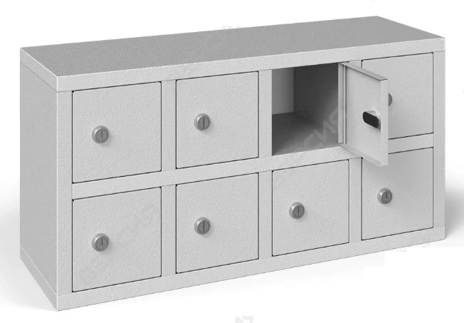 Шкаф для хранения мобильных телефонов на 8 ячеек, навесной. Отличный вариант для установки в различных административных и образовательных учреждениях. Все ячейки индивидуальные и закрываются на замок, дверца - р/р 118х114Н