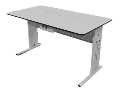 Двухместный лабораторный стол с нерегулируемой высотой, каркас металлический, оснащен блендой из перфорированного металлического листа, которая обеспечивает прочность и устойчивость конструкции. Форма столешницы прямоугольная, постформинг 25мм., Панелью с двумя розетками.