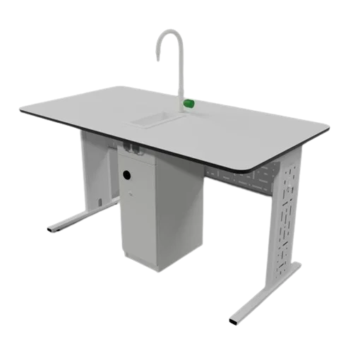 Двухместный лабораторный стол с нерегулируемой высотой, каркас металлический, оснащен блендой из перфорированного металлического листа, которая обеспечивает прочность и устойчивость конструкции. Форма столешницы прямоугольная, постформинг 25мм., с раковиной 200х135 (полипропиленовая) и смесителем (полипропиленовый). Тумба с распашной дверцей (ЛДСП 16 мм.) и панелью с двумя розетками.