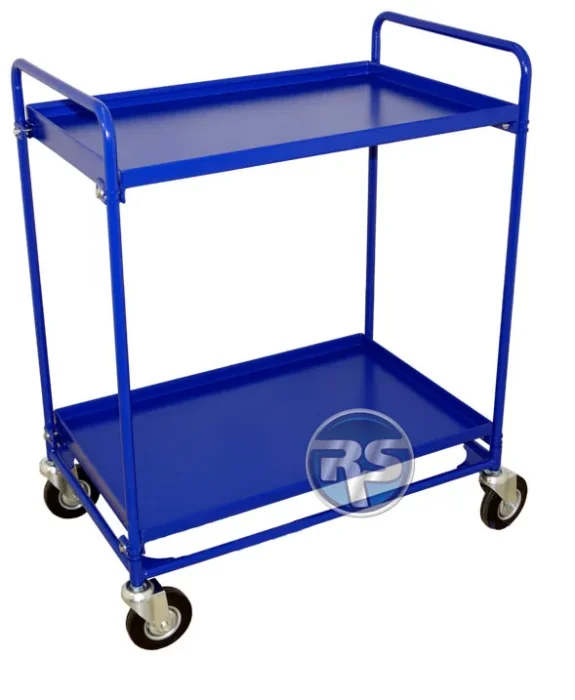 Сервисная тележка — незаменимое оборудование, для перемещения средств уборки, сухого белья, предметов интерьера и т. д. Грузоподъемность тележки рассчитывается из расчета 50 кг. распределенной нагрузки на полку. На тележку устанавливаются промышленные поворотные колесные опоры D125 мм. с резьбовой шпилькой М12. Базовая комплектация тележки состоит: - две ручки - основание - две полки с бортиком (высота бортика 30 мм) - комплект кронштейнов и метизов для установки полок. Высота тележки без колёс составляет 850мм.